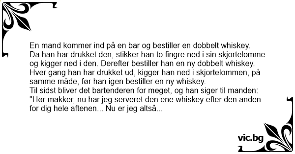"Hør makker, nu har jeg serveret den ene whiskey efter den anden for dig hele aftenen... Nu er jeg altså nysgerrig, hvad er det du har der i lommen?"