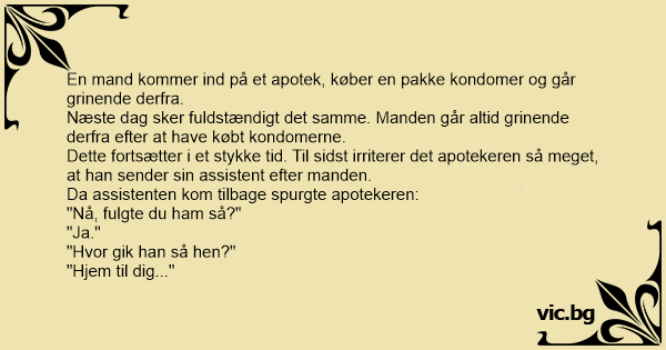 Leende En mand går ind på et apotek og spørger efter en pakke kondomer. Så snart han har betalt for dem, begynder manden at grine og går ud. Den næste dag sker nøjagtig det samme. Apotekeren synes,...