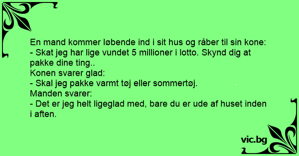 Mannen ringer hjem til kona: "Jeg har vunnet i Lotto - pakk kofferten!" "Sommer- eller vinterklær?" spør kona. "Det driter jeg i", svarer mannen. "Ut skal du!"