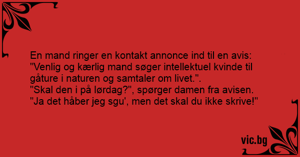 "Venlig og kærlig mand søger intellektuel kvinde til gåture i naturen og samtaler om livet.".