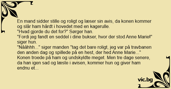 "Nååhhh..." siger manden "tag det bare roligt, jeg var på travbanen den anden dag og spillede på en hest, der hed Anne Marie..."