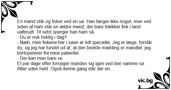 - Næh, men fiskene her i søen er lidt specielle. Jeg er læge, forstår du, og jeg har fundet ud af, at den bedste madding er mandler, jeg bortopererer fra mine patienter.