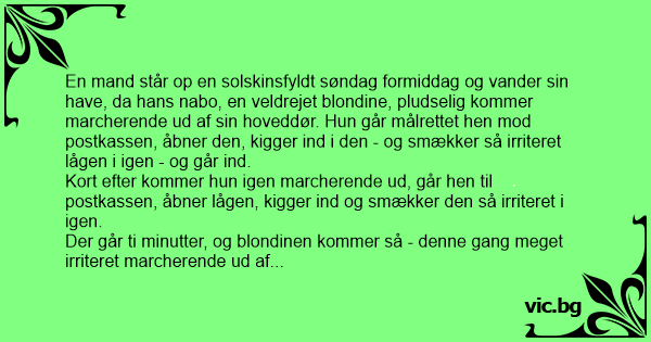 Der går ti minutter, og blondinen kommer så - denne gang meget irriteret marcherende ud af sin hoveddør. Går hen til postkassen, flår den åben og smækker den i med et brag.
