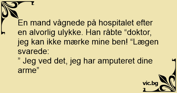 En mand vågnede på hospitalet efter en alvorlig ulykke. Han råbte “doktor, jeg kan ikke mærke mine ben! “Lægen svarede: