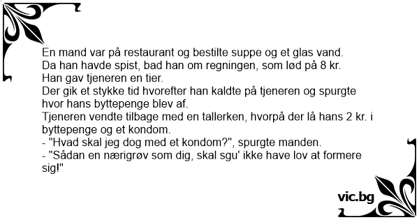 Tjeneren vendte tilbage med en tallerken, hvorpå der lå hans 2 kr. i byttepenge og et kondom.