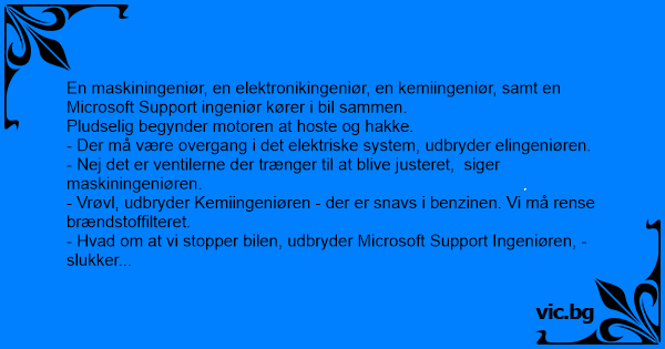 En maskiningeniør, en elektronikingeniør, en kemiingeniør, samt en Microsoft Support ingeniør kører i bil sammen.