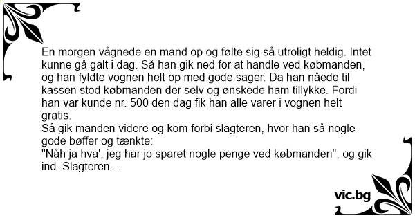 En morgen vågnede en mand op og følte sig så utroligt heldig. Intet kunne gå galt i dag. Så han gik ned for at handle ved købmanden, og han fyldte vognen helt op med gode sager. Da han nåede til kassen stod købmanden der selv og ønskede ham tillykke. Fordi han var kunde nr. 500 den dag fik han alle varer i vognen helt gratis.
