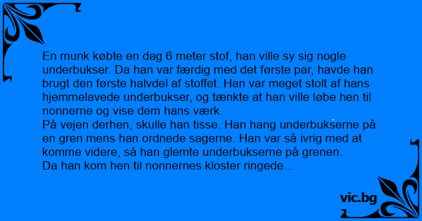 En munk købte en dag 6 meter stof, han ville sy sig nogle underbukser. Da han var færdig med det første par, havde han brugt den første halvdel af stoffet. Han var meget stolt af hans hjemmelavede underbukser, og tænkte at han ville løbe hen til nonnerne og vise dem hans værk.
