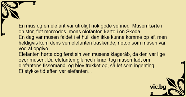 En mus og en elefant var utroligt nok gode venner. Musen kørte i en stor, flot mercedes, mens elefanten kørte i en Skoda.