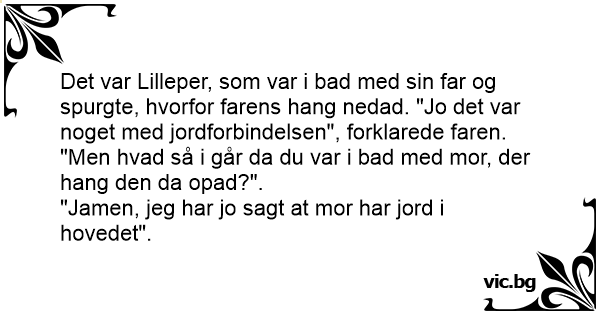 Det var Lilleper, som var i bad med sin far og spurgte, hvorfor farens hang nedad. "Jo det var noget med jordforbindelsen", forklarede faren.