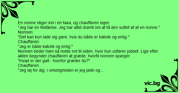 En nunna åker buss, och säger till chauffören: - Jag är dödligt sjuk, och har aldrig haft sex, jag vill inte dö nyfiken. Jag skulle vilja ha sex med dig, men bara om du inte är gift. - Jag är inte gift, ljuger chauffören. - Men jag måste dö oskuld,...