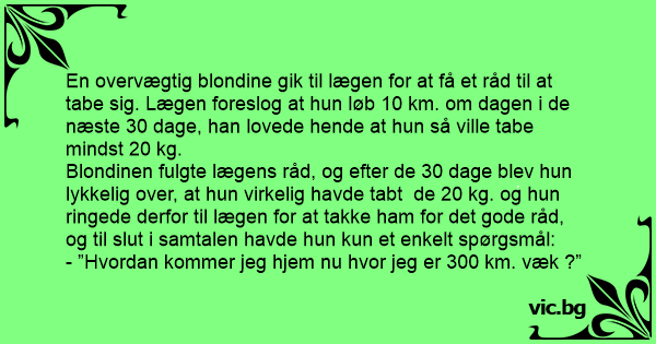 Blondinen fulgte lægens råd, og efter de 30 dage blev hun lykkelig over, at hun virkelig havde tabt de 20 kg. og hun ringede derfor til lægen for at такке ham for det gode råd, og til sluт i samtalen havde hun kun et enkelt spørgsmål: