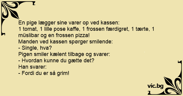 A woman was paying for some items in a supermarket - a pint of milk, a packet of bacon, a small bag of rice and a few vegetables. The man at the checkout said, "I bet you're single, aren't you?" "Well yes, I am," the woman replied. "How did you know?" "Because you're really ugly," replied the man.