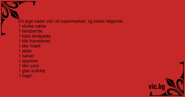En kvinna kommer in i affären och köper lite saker, hon kommer fram till kassan och lägger upp en banan, ett äpple, en tandborste, en schampoflaska, en tvål, en kam, en apelsin, en tandkräm, en...