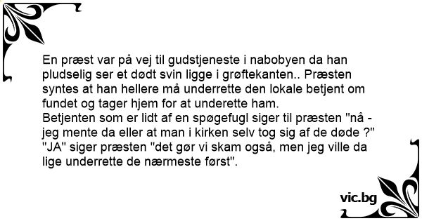 En præst var på vej til gudstjeneste i nabobyen da han pludselig ser et dødt svin ligge i grøftekanten.. Præsten syntes at han hellere må underrette den lokale betjent om fundet og tager hjem for at underette ham.