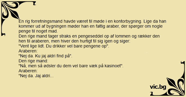 En rig forretningsmand havde været til møde i en kontorbygning. Lige da han kommer ud af bygningen møder han en fattig araber, der spørger om nogle penge til noget mad.