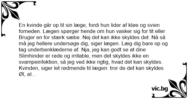 Bruger en for stærk sæbe. Nej det kan ikke skyldes det. Nå så må jeg hellere undersøge dig, siger lægen. Læg dig bare op og tag underbenklæderne af. Nja, jeg kan godt se at dine