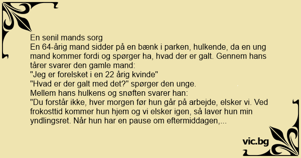 "Du forstår ikke, hver morgen før hun går på arbejde, elsker vi. Ved frokosttid kommer hun hjem og vi elsker igen, så laver hun min yndlingsret. Når hun har en pause om eftermiddagen, skynder hun sig hjem og tilfredsstiller mig oralt, og så ved aftentid og hele natten elsker vi igen." Den gamle mand knækker sammen og kan ikke sige emre.