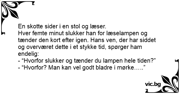 Шотландец седи на стол и чете. На всеки пет минути той изключва лампата за четене и малко след това я включва отново. Приятелят му, който гледа това от известно време, накрая го пита: - Защо гасиш...