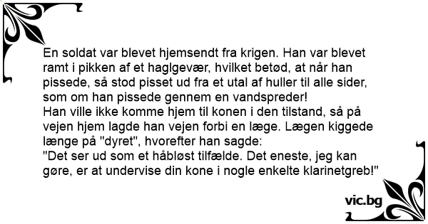 En soldat var blevet hjemsendt fra krigen. Han var blevet ramt i pikken af et haglgevær, hvilket betød, at når han pissede, så stod pisset ud fra et utal af huller til alle sider, som om han pissede gennem en vandspreder!