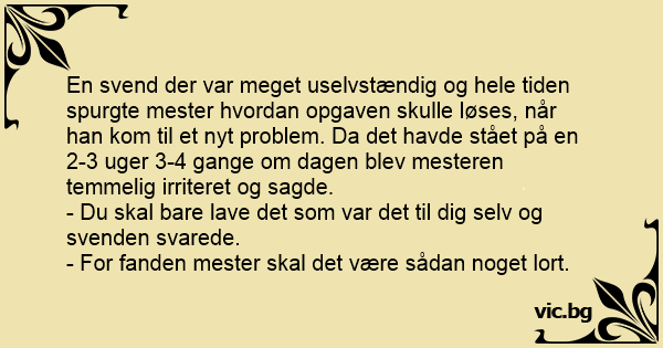 En svend der var meget uselvstændig og hele tiden spurgte mester hvordan opgaven skulle løses, når han kom til et nyt problem. Da det havde stået på en 2-3 uger 3-4 gange om dagen blev mesteren temmelig irriteret og sagde.