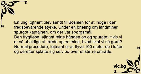 En ung løjtnant blev sendt til Bosnien for at indgå i den fredsbevarende styrke. Under en briefing om landminer spurgte kaptajnen, om der var spørgsmål.