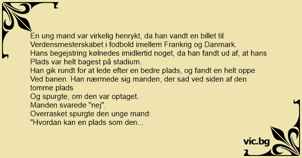 Finalen i fodbold-VM spilles for et udsolgt stadion. Men en tilskuer ser, at sædet ved siden af er tomt. Til manden på den anden side af sædet siger han: - Hvem er så skør at købe billet til...