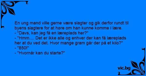 - "Hmm.... Det er ikke alle og enhver der kan få læreplads her at du ved det. Hvor mange gram går der på et kilo?"