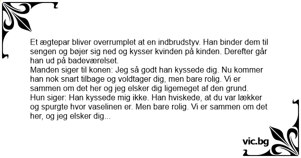 Manden siger til konen: Jeg så godt han kyssede dig. Nu kommer han nok snart tilbage og voldtager dig, men bare rolig. Vi er sammen om det her og jeg elsker dig ligemeget af den grund.