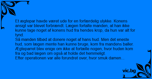 Et ægtepar havde været ude for en forfærdelig ulykke. Konens ansigt var blevet forbrændt. Lægen fortalte manden, at han ikke kunne tage noget af konens hud fra hendes krop, da hun var alt for tynd.