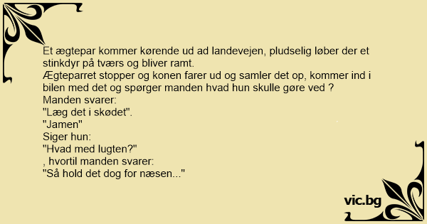 Et ægtepar kommer kørende ud ad landevejen, pludselig løber der et stinkdyr på tværs og bliver ramt.