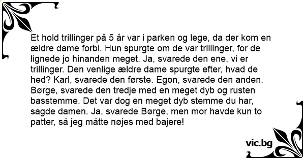 Et hold trillinger på 5 år var i parken og lege, da der kom en ældre dame forbi. Нun spurgte om de var trillinger, for de lignede jo hinanden meget. Ja, svarede den ene, vi er trillinger. Den venlige ældre dame spurgte efter, hvad de hed? Karl, svarede den første. Egon, svarede den anden. Børge, svarede den tredje med en meget dyb og rusten basstemme. Det var dog en meget dyb stemme du har, sagde damen. Ja, svarede Børge, men mor havde kun to patter, så jeg måtte nøjes med bajere!