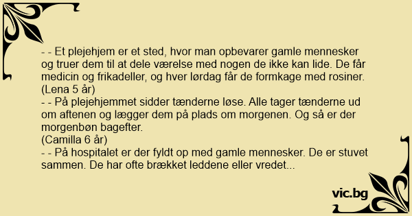 - - Et plejehjem er et sted, hvor man opbevarer gamle mennesker og truer dem til at dele værelse med nogen de ikke kan lide. De får medicin og frikadeller, og hver lørdag får de formkage med rosiner.