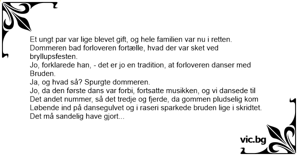 Jo, da den første dans var forbi, fortsatte musikken, og vi dansede til Det andet nummer, så det tredje og fjerde, da gommen pludselig kom Løbende ind på dansegulvet og i raseri sparkede bruden lige i skridtet.