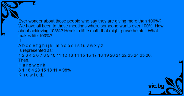 Ever wonder about those people who say they are giving more than 100%? We have all been to those meetings where someone wants over 100%. How about achieving 103%? Here's a little math that might prove helpful. What makes life 100%?
