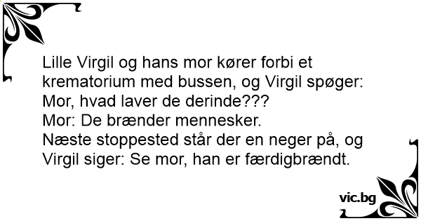 Lille Virgil og hans mor kører forbi et krematorium med bussen, og Virgil spøger: Mor, hvad laver de derinde???