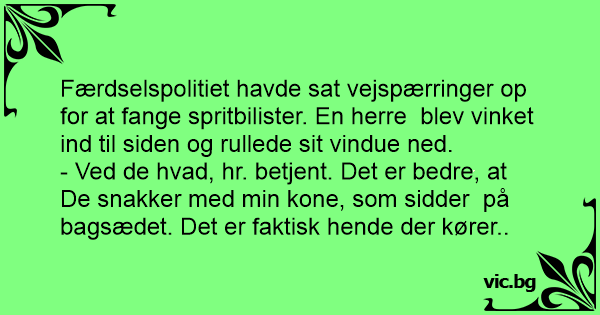 - Ved de hvad, hr. betjent. Det er bedre, at De snakker med min kone, som sidder på bagsædet. Det er faktisk hende der kører..