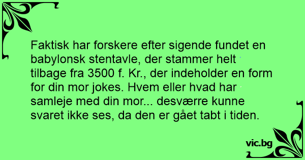 Faktisk har forskere efter sigende fundet en babylonsk stentavle, der stammer helt tilbage fra 3500 f. Kr., der indeholder en form for din mor jokes. Hvem eller hvad har samleje med din mor... desværre kunne svaret ikke ses, da den er gået tabt i tiden.
