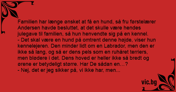 Familien har længe ønsket at få en hund, så fru førstelærer Andersen havde besluttet, at det skulle være hendes julegave til familien, så hun henvendte sig på en kennel.