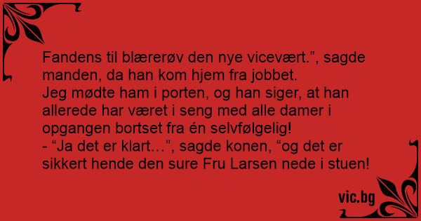 - “Ja det er klart…”, sagde konen, “og det er sikkert hende den sure Fru Larsen nede i stuen!