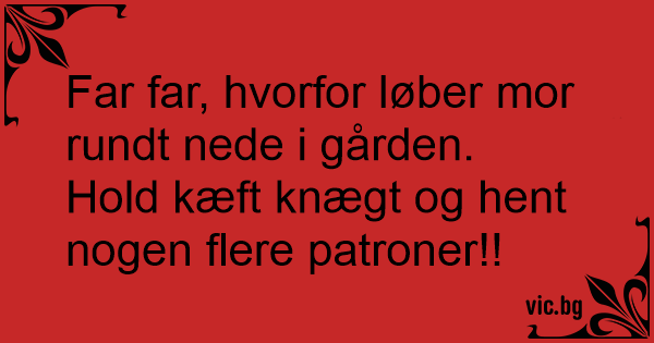Mama, Mama, warum rennt Papa... Баща и син седят на покрива на къща. Дете пита баща си: Mammi, Mammi, warum läuft der Papa so im Zickzack? Sei ruhig, lad' durch und schieß weiter! Was macht frau, wenn ein Mann im Zickzack durch ihren Garten läuft? - Weiterschießen. - Dis Papa, pourquoi Maman, elle court en zig-zag ? - Tais-toi, et passe moi les cartouches. Syn pyta się taty: - Tatusiu, a dlaczego mama tak zasuwa zygzakiem po polu?! Ojciec odpowiada: - Ty nie gadaj, tylko podawaj naboje. Маленький хлопчик запитує у тата: "Тату, а чому моя бабуся туди сюди так швидко бігає?" Тато відповідає: "Кому бабуся, а кому теща! Ану синку подай набої!" — Тату, тату, а чому наша бабуся по городу повза як змія?? — Для кого бабуся, а для кого теща. Подай ще 2 патрони. Un petit garçon demande à son père : - Papa ! Pourquoi mamie court en zig-zag dans le jardin ? - Ne me déconcentre pas fiston ! Je ne voudrais pas rater ma cible ! Papá, papá, ¿Por qué mi mamá corre en zig zag? Cierra la boca y pásame más cartuchos. - Tėveli, tėveli, kodėl močiutė laipioja sienomis ? - Kam močiutė, o kam - uošvė! - atsako tėvas, keisdamas apkabą. Mor, Mor! Hvorfor løber far i zigzag nede i gården Mor, Mor! Hvorfor løber far i zigzag nede i gården? Hold kæft og giv mig nogle flere patroner. Papa ¿porqué la abuela dá estos saltos en el jardín?...- ¡Calla niño y tráeme mas cartuchos!.. Tėvas su sūnumi stovi balkone. Tėvas laiko šautuvą , o sūnus netikėtai klausia tėvo : - Tėveli, kodėl mūsų močiutė bėgioja zigzagais ? - Kam močiutė, o kam uošvienė, paduok dar vieną apkabą,-... - Papa, pourquoi Mamie court en zigzag dans le jardin? - Tais-toi, à force de me déconcentrer, tu vas me faire rater ma cible! Bula, catre tatal Lui: - Tata, de ce fuge mamica in zig-zag? - Taci si adu cartusele!... Liz løber zigzag hen over marken. Per kommer ud og stiller sig ved siden af sin far. "Far, hvorfor løber Liz zigzag hen over marken?" "Hold kæft knægt og stik mig nogle flere patroner!" - De ce fuge tata în zig-zag, mamă? - Taci şi mai adu gloanţe! Alinuta: De ce fuge mama in zig-zag, tata? Tatal: Taci si adu niste gloante!
