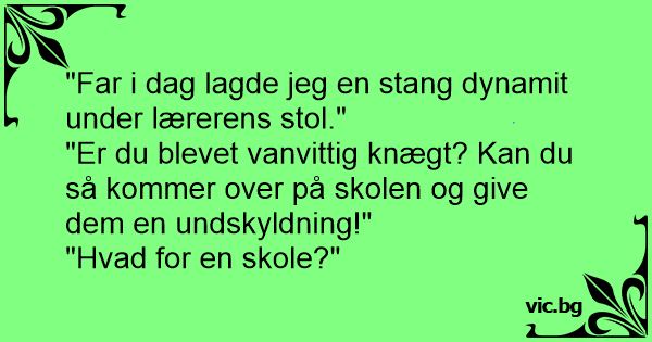 Hvad har i lært i skolen idag? - At lave krudt. - Jaså, og hvad skal i så lave i skolen imorgen? - Hvilken skole?