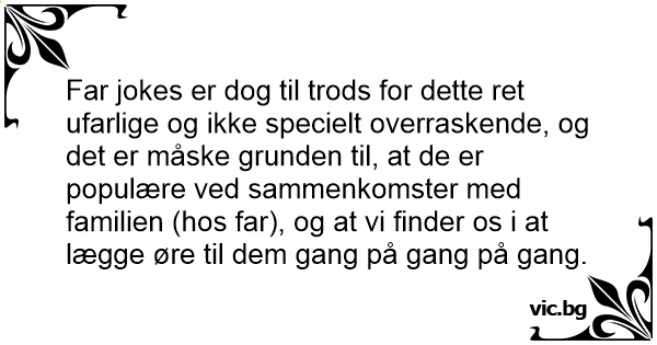 Far jokes er dog til trods for dette ret ufarlige og ikke specielt overraskende, og det er måske grunden til, at de er populære ved sammenkomster med familien (hos far), og at vi finder os i at lægge øre til dem gang på gang på gang.