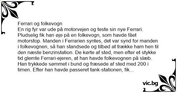 En rig fyr var ude på motorvejen og теsте sin nye Ferrari. Pludselig fik han øje på en folkevogn, som havde fået motorstop. Manden i Ferrarien syntes, det var synd for manden i folkevognen, så han standsede og tilbød at trække ham hen til den næste benzinstation. De kørte af sted, men efter et stykke tid glemte Ferrari-ejeren, at han havde folkevognen på slæb. Han trykkede sømmet i bund og fræsede af sted med 200 i timen. Efter han havde passeret tank-stationen, fik politiet en opringning: