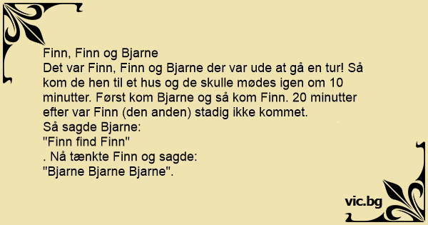 Det var Finn, Finn og Bjarne der var ude at gå en tur! Så kom de hen til et hus og de skulle mødes igen om 10 minutter. Først kom Bjarne og så kom Finn. 20 minutter efter var Finn (den anden) stadig ikke kommet.