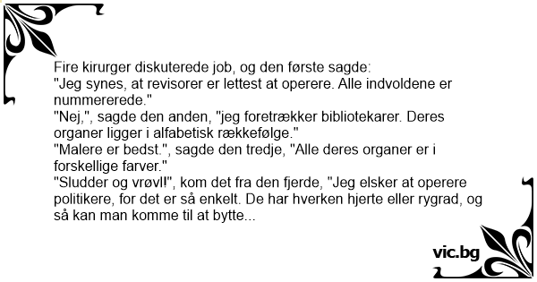 "Sludder og vrøvl!", kom det fra den fjerde, "Jeg elsker at operere politikere, for det er så enkelt. De har hverken hjerte eller rygrad, og så kan man komme til at bytte rundt på hoved og røv, uden at nogen opdager det!"