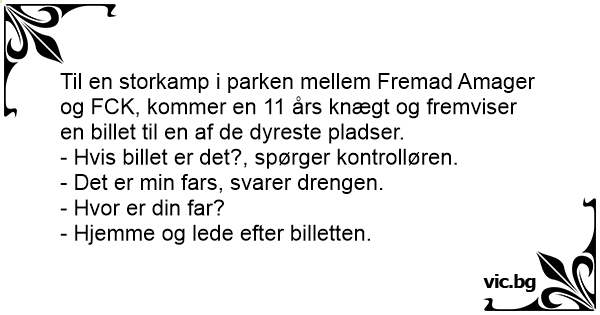 Bij een zeer belangrijke voetbalwedstrijd stapt een jongetje van een acht het stadion binnen met zijn kaartje voor de VIP-tribune. De controleur kijkt hem verbaasd aan en zegt: "Zo zo, jongeman dat...