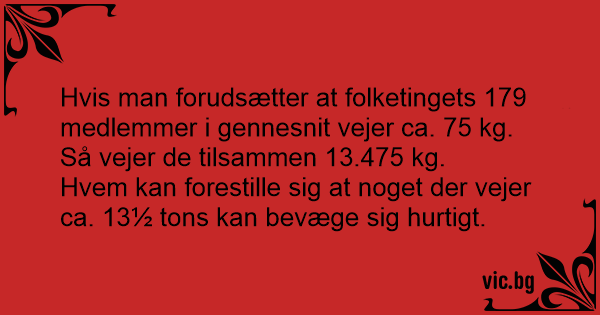 Hvis man forudsætter at folketingets 179 medlemmer i gennesnit vejer ca. 75 kg. Så vejer de tilsammen 13.475 kg.