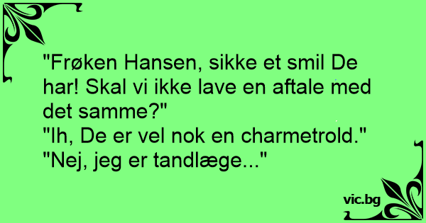 Усмивката.. "Frau Schneider, wenn Sie mich so anlachen, wünschte ich mir, dass Sie mich besuchen kommen.",- "Sie Schmeichler, Sie.",- "Nun ja, wie man es nimmt - ich bin Zahnarzt." Mężczyzna do kobiety: - Gdy widzę pani uśmiech, mam nadzieję, że złoży mi pani wizytę. - Podrywacz z pana! - Nie, dentysta. Hij: "Mevrouw, als u zo naar mij lacht, dan weet ik dat ik u binnenkort weer zie!" Zij: "Nou, u bent nog al overtuigd van uzelf!" Hij: "Nee, ik ben tandarts!" A boy met a girl.... Girl: Every time you smile, I feel like inviting you to my place. Boy (smiling): Why thank you... are you single? Girl: No, I am a dentist. Un mec, une nana : – À chaque fois que tu souris, j’ai envie de te ramener chez moi. – Ah ! Tu es célibataire ? – Non, dentiste… - Liisa, nähdessäni hymysi aavistan, että tapaamme vielä uudelleen. - Oletko selvännäkijä? - En, vaan hammaslääkäri. — Дівчино, коли я бачу вашу посмішку, мені хочеться запросити вас до себе. — Ви нахаба! — Ні, я стоматолог. - Valahányszor meglátom önt mosolyogni, asszonyom, mindig arra gondolok, hogy fel kellene csábítanom a lakásomra. - Nocsak, nocsak! Ekkora nagy nőcsábász? - Nem asszonyom, fogorvos vagyok. A guy is talking to a girl A guy is talking to a girl : "Everytime I see your smile, I want to take you to my place" "Oh ! You think I'm pretty ?" "No, I'm a dentist." I was on a train and this woman opposite looked at me and said "Every time you smile, I feel like inviting you to my place..." I asked "Are you single?" She replied "No, I'm a dentist." - Når jeg ser på Deres smil, frøken, er jeg sikker på, vi snart får en aftale. - De er vist en værre scoretrold. - Næh, jeg er tandlæge.