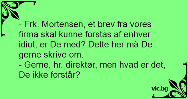 - Frk. Mortensen, et brev fra vores firma skal kunne forstås af enhver idiот, er De med? Dette her må De gerne skrive om.